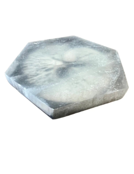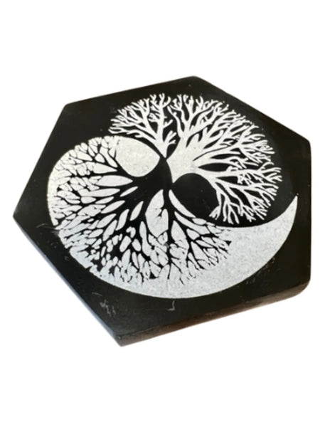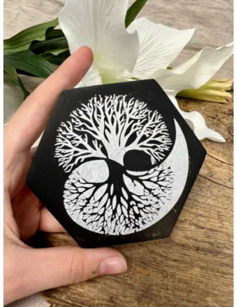 Hexagon oplaadsteen van ca. 9,5 x 9 x 1 cm en weegt ca. 100 gram. De Yin Yang Seleniet heeft een gravure van een levensboom. Afkomstig uit Marokko. Ideaal om kleine steentjes op te leggen om op te laden.