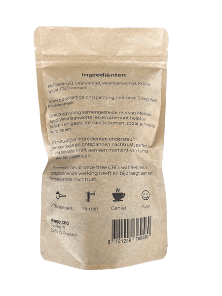 Ontspan, ontlaad en kom tot rust met onze Sleep Well Thee – een kalmerende kruidenthee speciaal samengesteld voor de avond. De natuurlijke combinatie van melisse, valeriaanwortel, kruizemunt en oranjeblad helpt je om de dag rustig af te sluiten. De toevoeging van wateroplosbare CBD brengt balans in lichaam en geest, zodat jij ontspannen kunt genieten van een goede nachtrust.